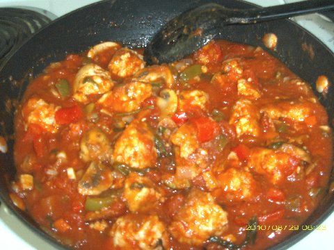 If you are making your marinara sauce from ‘scratch’ then add the crushed and diced garlic, chopped onion, and red bell pepper that you have cut up into bite sized pieces. Sauté the vegetable for several minutes but do not over cook.